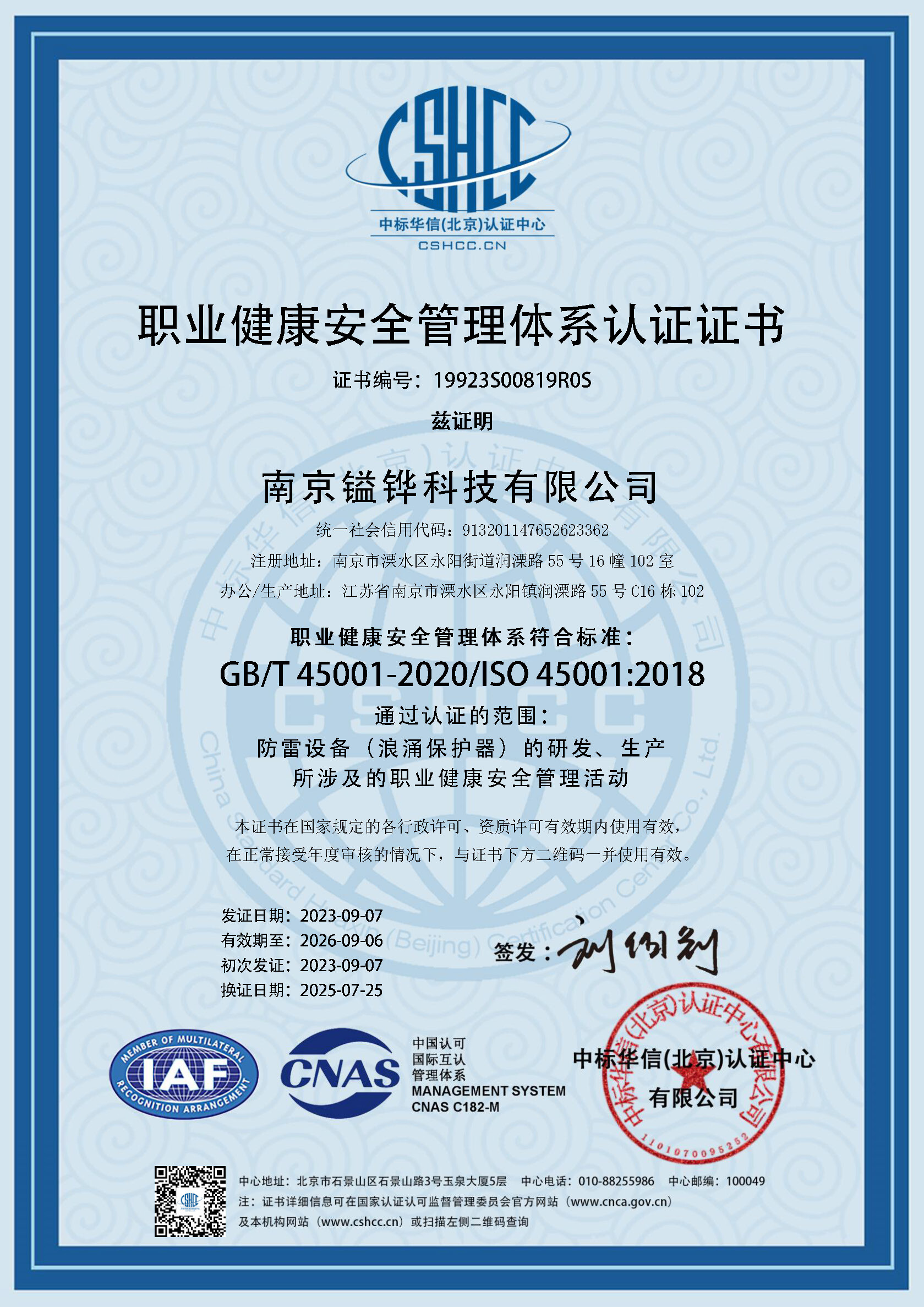 职业健康安全管理体系认证证书